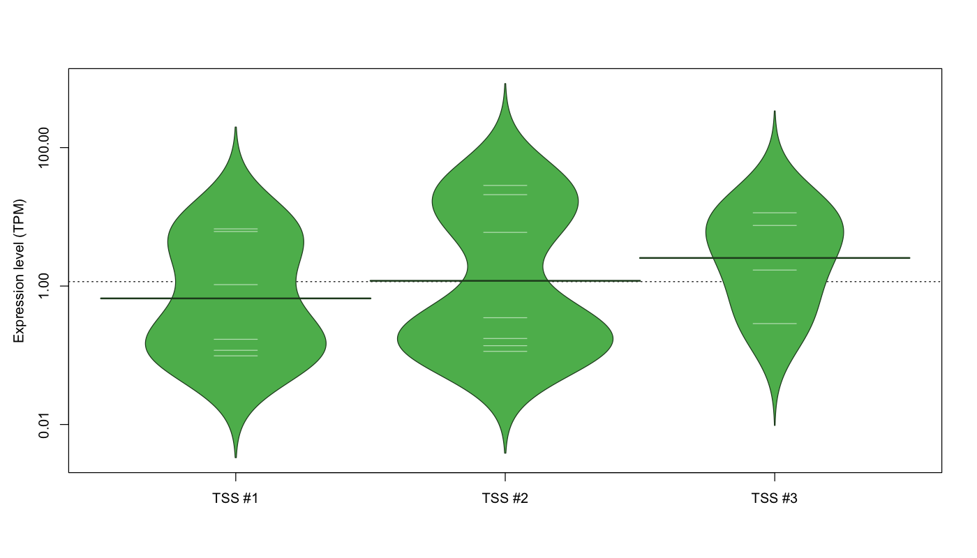 TSS expression levels were studied across 1829 TSS-CAGE libraries, based on FANTOM5 data.