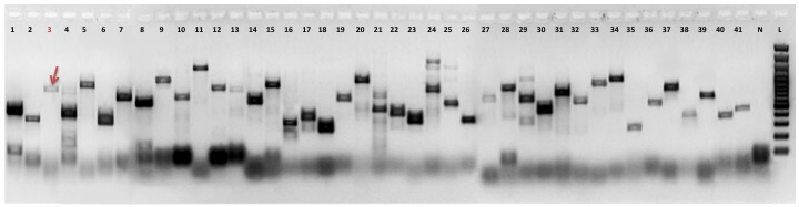 Additional comment: Red arrow indicates PCR product of retrogene in pooled cDNA from 16 human tissues (Clontech). Red number of lane indicates particular retrogene; L - GeneRuler 100 bp DNA Ladder (Thermo Fisher Scientific); N - No template control (water instead of cDNA)